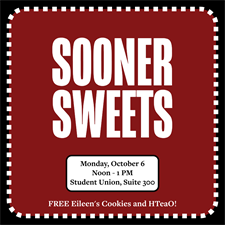 Join us during Fall for OU Week at Sooner Sweets! Enjoy FREE Eileen's Cookies and HTeaO, connect with fellow students, meet the friendly faces of Student Affairs, and snap a photo in our photo booth.