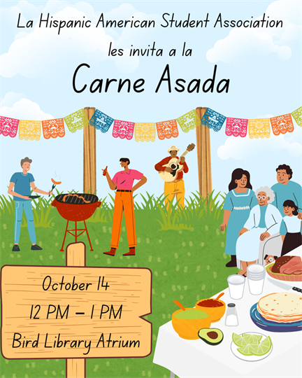 Join HASA for our closing event in celebrating Hispanic Heritage Month with a carne asada on Tuesday, October 14, at the Bird Library Patio! From 12 PM to 1 PM, we'll be enjoying delicious food. Food is on a first-come, first-served basis, though we will have plenty of food to go around, as this is our most anticipated event of the year. Please celebrate with us!