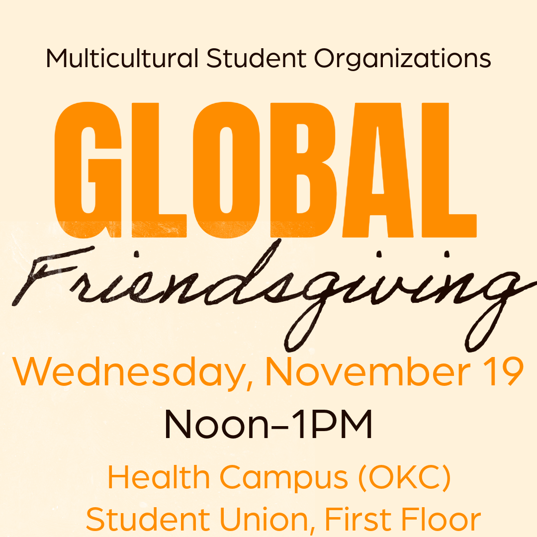 🌍 Global Friendsgiving 📅 Date: Wednesday, November 19th 🕛 Time: 12:00 PM – 1:00 PM 📍 Location: Health Campus (OKC) Student Union, First Floor