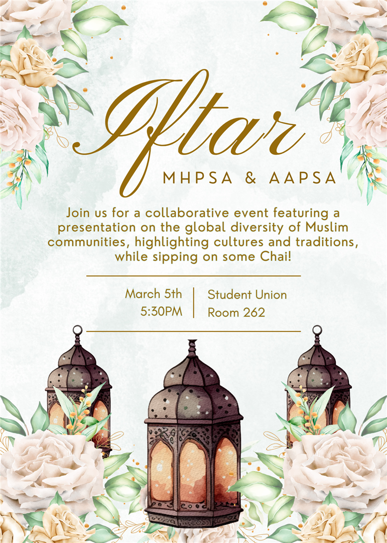 Join both the Muslim Health Professional Student Association and the Asian American Professional Student Association for an event featuring a presentation on the global diversity of Muslim communities while enjoying some chai. Hope to see you there!