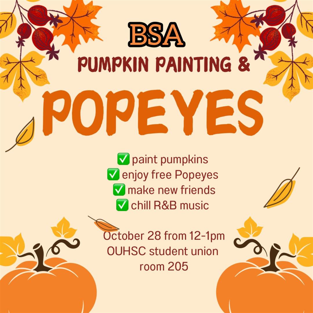 Join BSA on Tuesday, October 28th from 12-1pm in Student Union room 205 for Pumpkin Painting & Popeyes!! We will have food, music, and all the supplies to get creative and in the fall spirit! See you there!