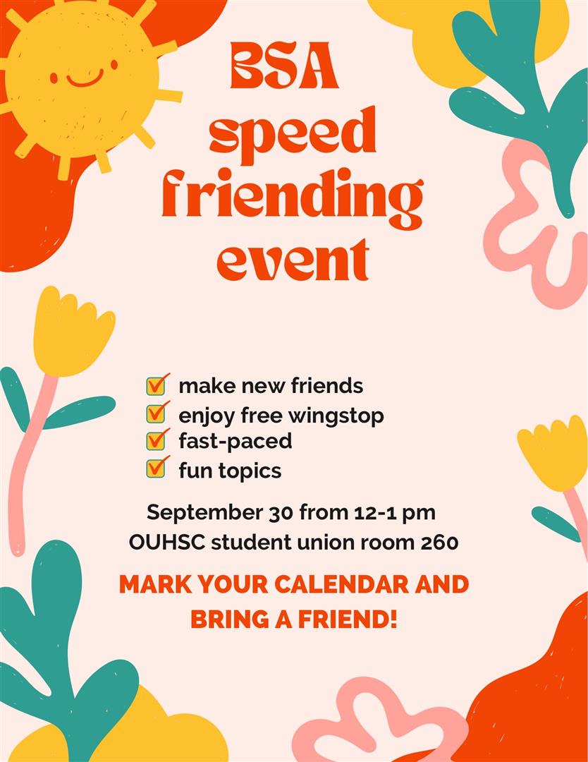 Join BSA on Tuesday September 30th at 12-1PM in Student Union Room 260 for our 2nd annual Speed Friending event! Bring a friend and meet some new ones! Lunch will be provided. See you there!