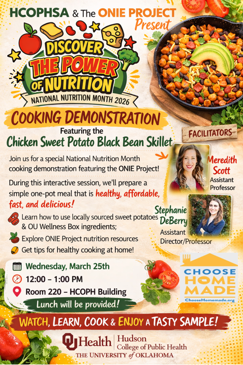 Join us for a special National Nutrition Month cooking demonstration featuring the ONIE Project! During this interactive session, we’ll prepare the delicious Chicken Sweet Potato Black Bean Skillet, a simple one-pot meal that highlights how healthy cooking can be affordable, fast, and delicious.